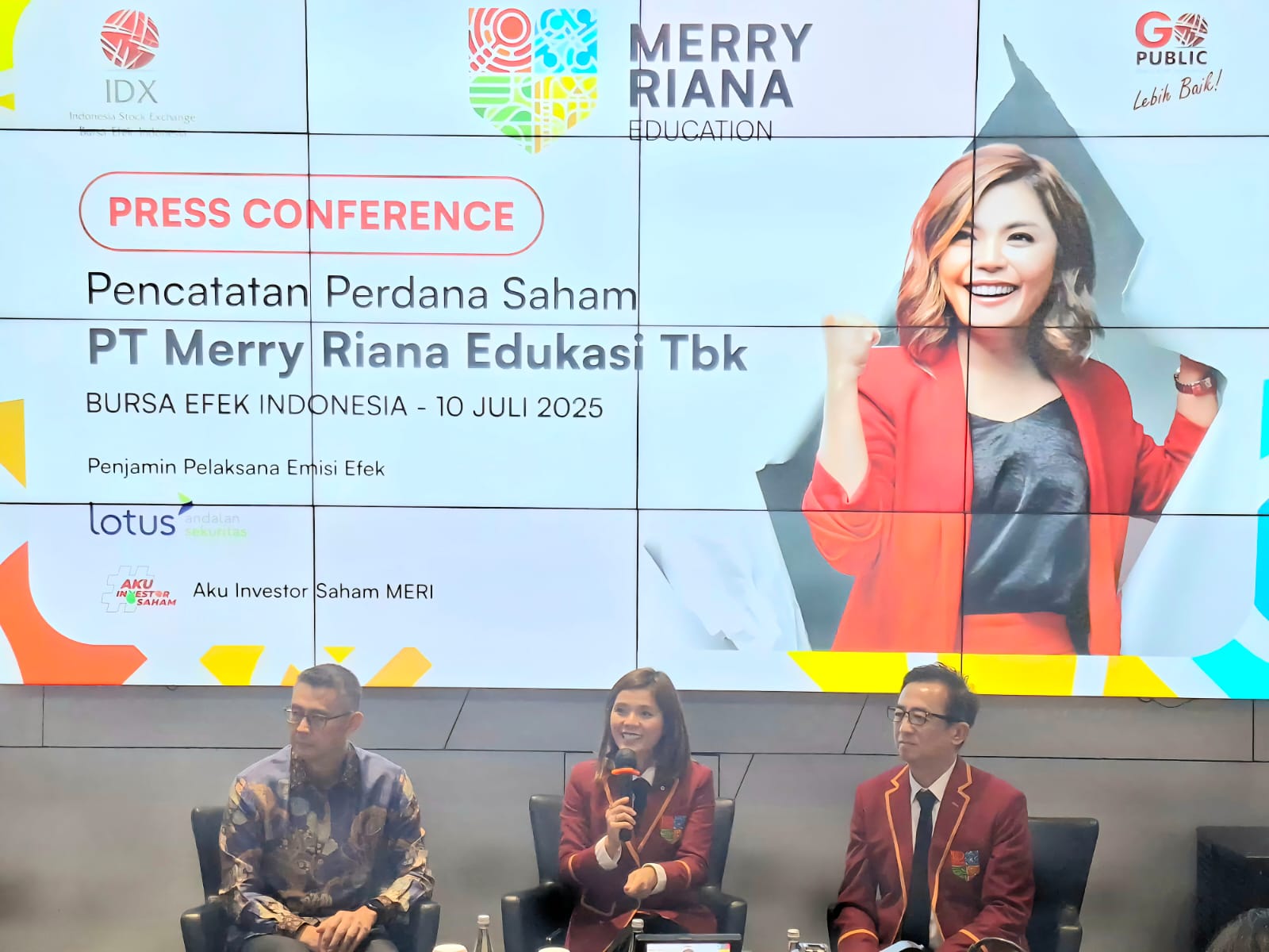 Sebagai bagian dari momen penting tersebut, MERI menyelenggarakan konferensi pers di Gedung Bursa Efek Indonesia, Jakarta. Acara ini dihadiri oleh sejumlah tokoh penting, antara lain Merry Riana selaku Founder PT Merry Riana Edukasi Tbk, Hermanto Tanoko selaku CEO PT Tancorp Investama Mulia yang juga merupakan investor strategis MERI, serta Wientoro Prasetyo, Direktur Utama PT Lotus Andalan Sekuritas sebagai Penjamin Pelaksana Emisi Efek. Turut hadir pula jajaran tim dari Merry Riana Edukasi dan puluhan awak media.